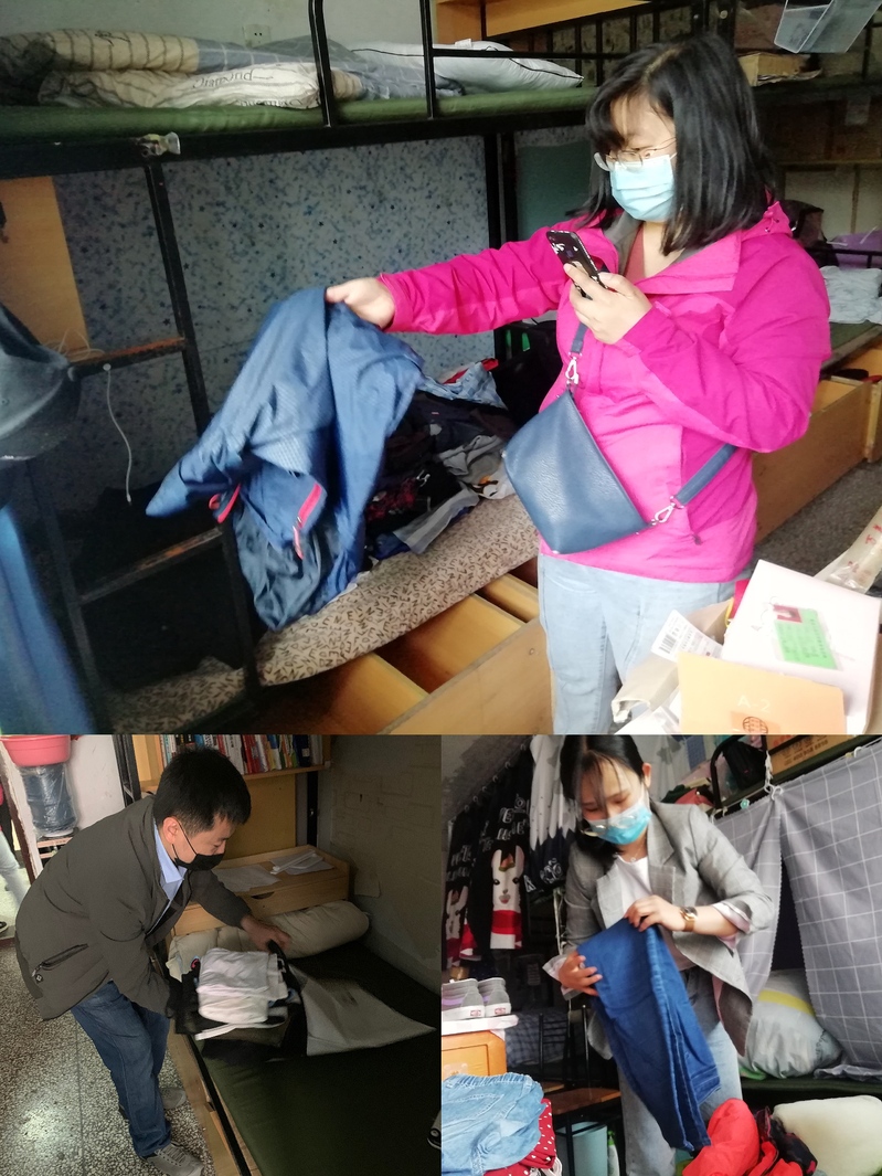 进入员工寝室需要向公司宿舍科申请,体温检测合格方可进入员工寝室内,取衣物时,为了提高效率,几位老师采用与员工实时视频的方式获取员工衣物,并按照寝室班级将取得的衣物编号,以便邮寄时好区分。